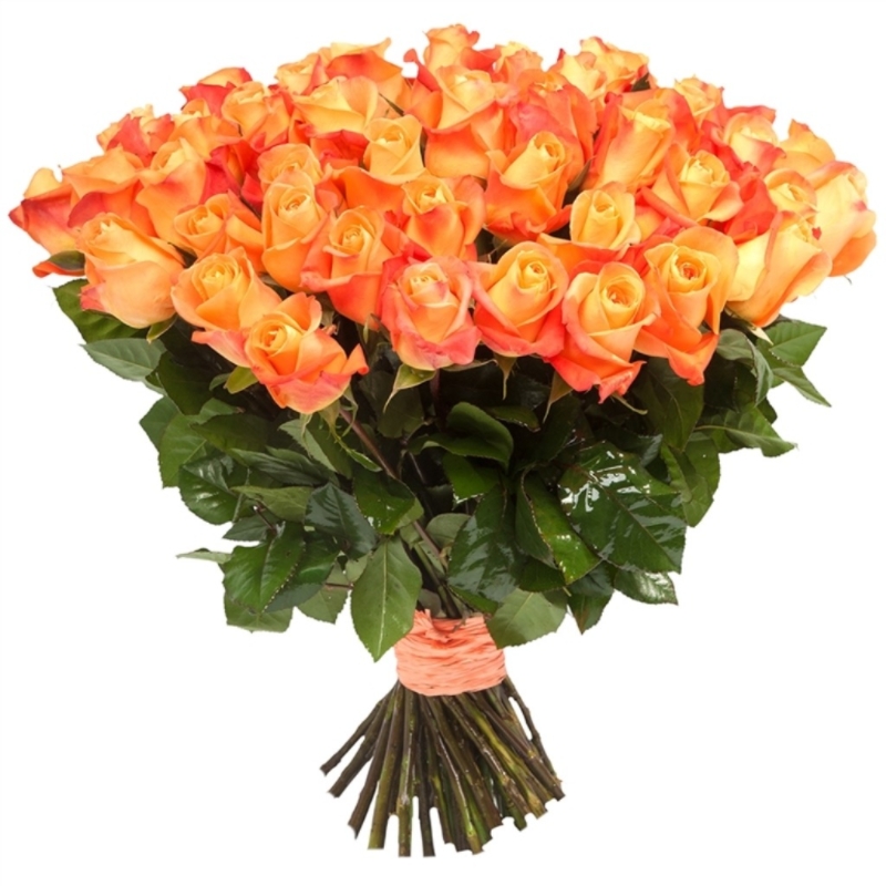 Букет состоит из 75 коралловых роз, прозрачная упаковка, атласная лента.