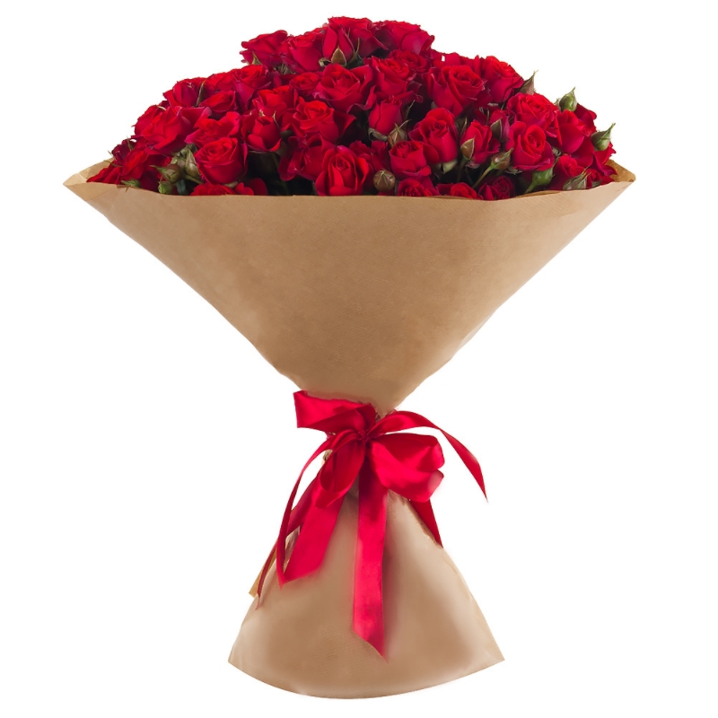 Букет состоит из 25 красных кустовых роз, крафт, атласная лента.
