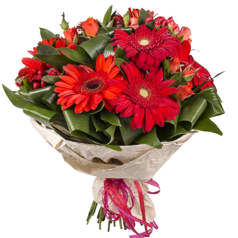 Букет состоит из 7 гербер, 4 ветки кустовых роз, 2 гиперикума, аспидистра, крафт, лента.