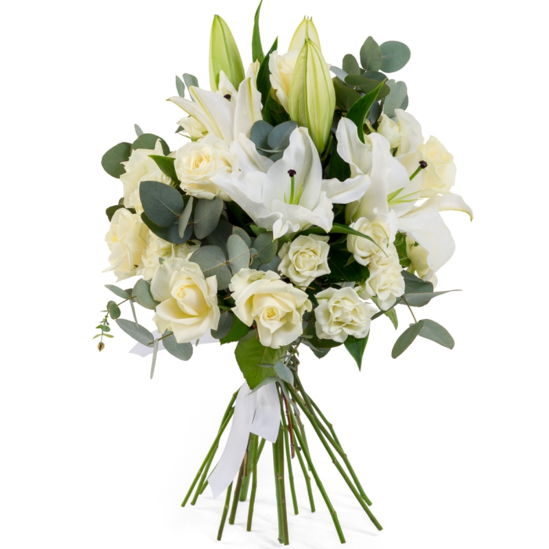 Букет состоит из 11 белых роз, 3 белые лилии, зелень, прозрачная упаковка, атласная лента.