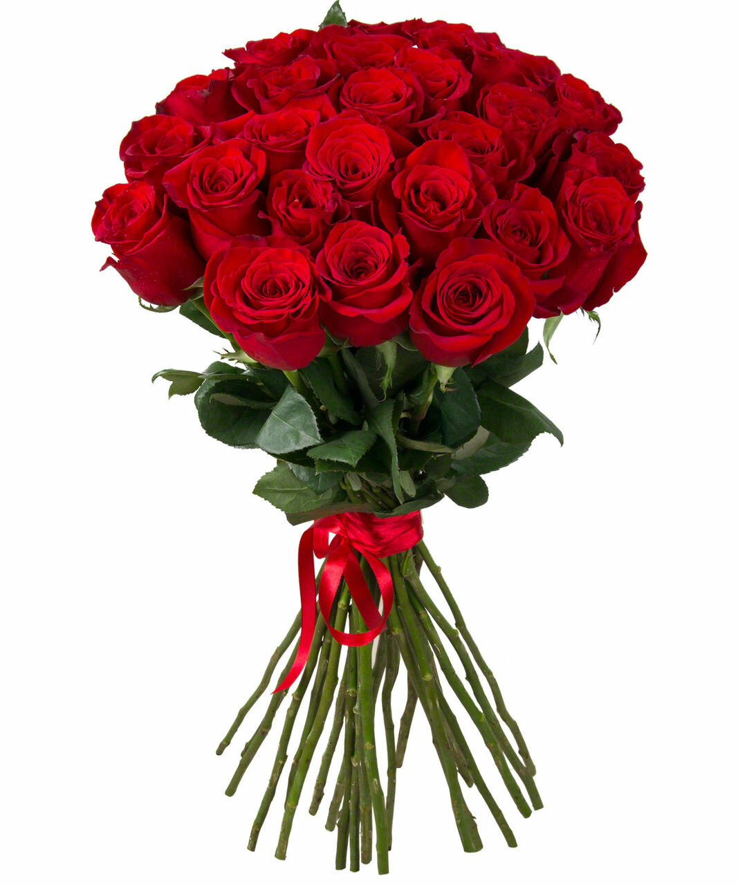 Букет состоит из 27 красных роз, прозрачная упаковка, атласная лента.